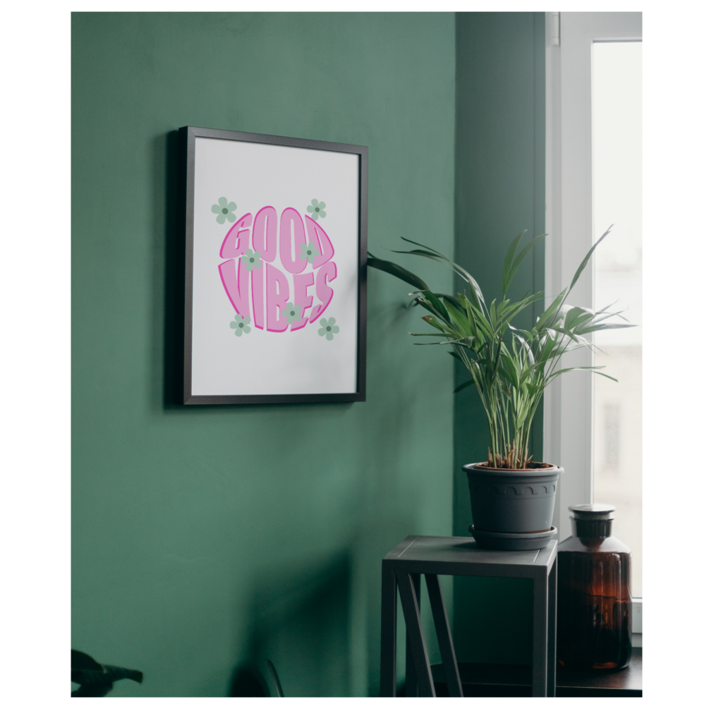 Dive into the nostalgic vibes of the '70s with our exclusively designed digital print that showcases the iconic 'Good Vibes' phrase in playful pink script, complemented by groovy green florals. This piece is not just a digital file; it's a gateway to reviving the carefree, joyful spirit of a beloved era, all while adding a pop of colour and positivity to your space. 💖